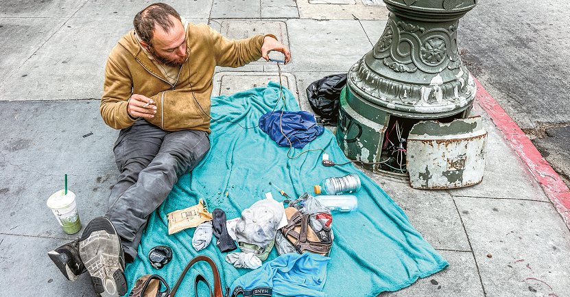 A homeless man was seen on May 29 in Koreatown, Los Angeles, opening a streetlight power box on the sidewalk along Wilshire Boulevard to charge his phone.