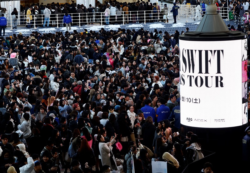 People stand in front of the venue of Taylor Swift’s international tour named “The Eras Tour” in Tokyo, Japan, February 7, 2024. [REUTERS]