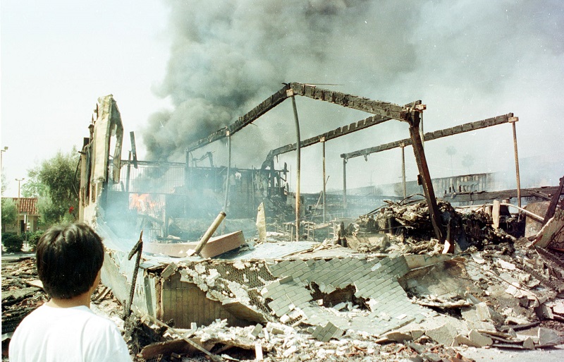 A Korean immigrant gazes upon his business, utterly consumed by arson during the L.A. riots in 1992. [JoongAng Photo]