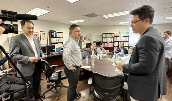 Front row, from left: Alex Cha, Ben Park, and Brandon Lee seen leaving the special board meeting of the Los Angeles Korean Festival Foundation on July 25. [Sangjin Kim, The Korea Daily]