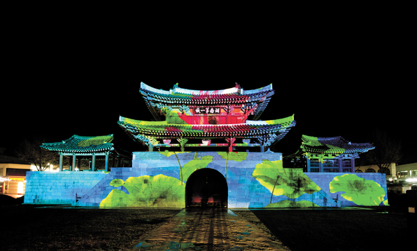 But the city in North Jeolla, in collaboration with the Korea Creative Content Agency, has stepped in to show that there is more to enjoy in the village even after dark.Right across from the hanok (traditional Korean home) village, a gigantic 47-by-16.2-meter (154-by-53-foot) screen has been set up in front of Pungnam Gate (Treasure No. 308), the southern gate of Jeonju Castle. This media facade uses the gate as its canvas on which to play different videos that highlight not only the beauty of the gate itself but also other traditional culture.