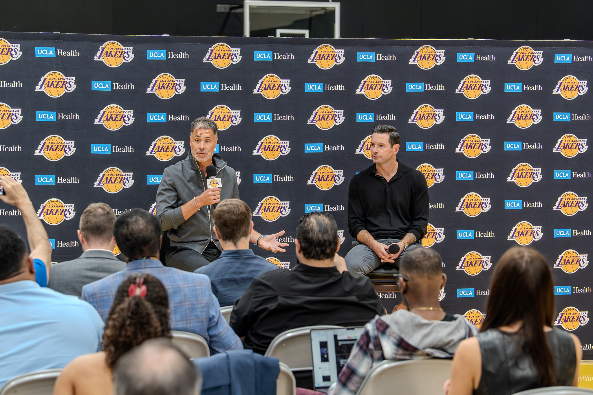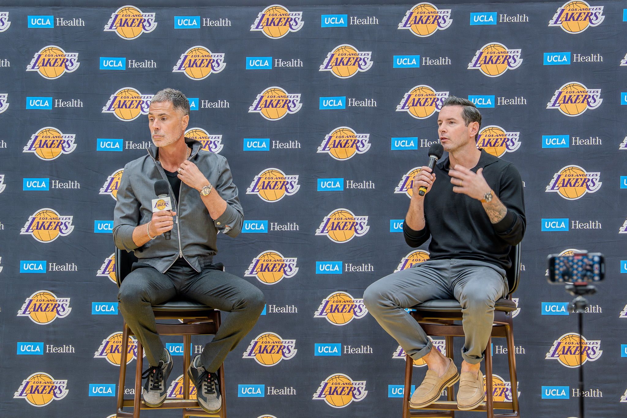 Rob Pelinka and JJ Redick speak at the Lakers 2025 press conference at UCLA Health Training Center