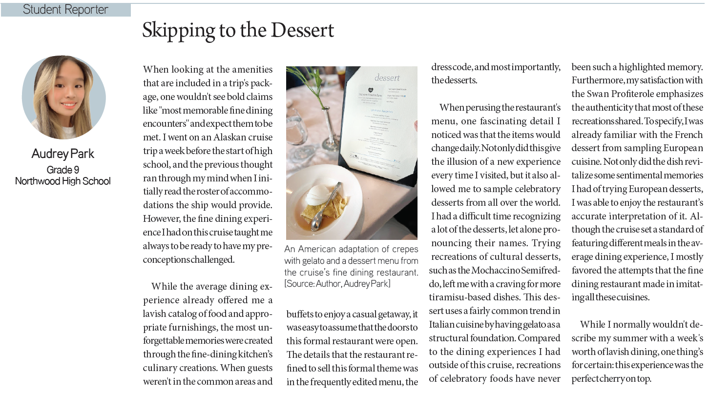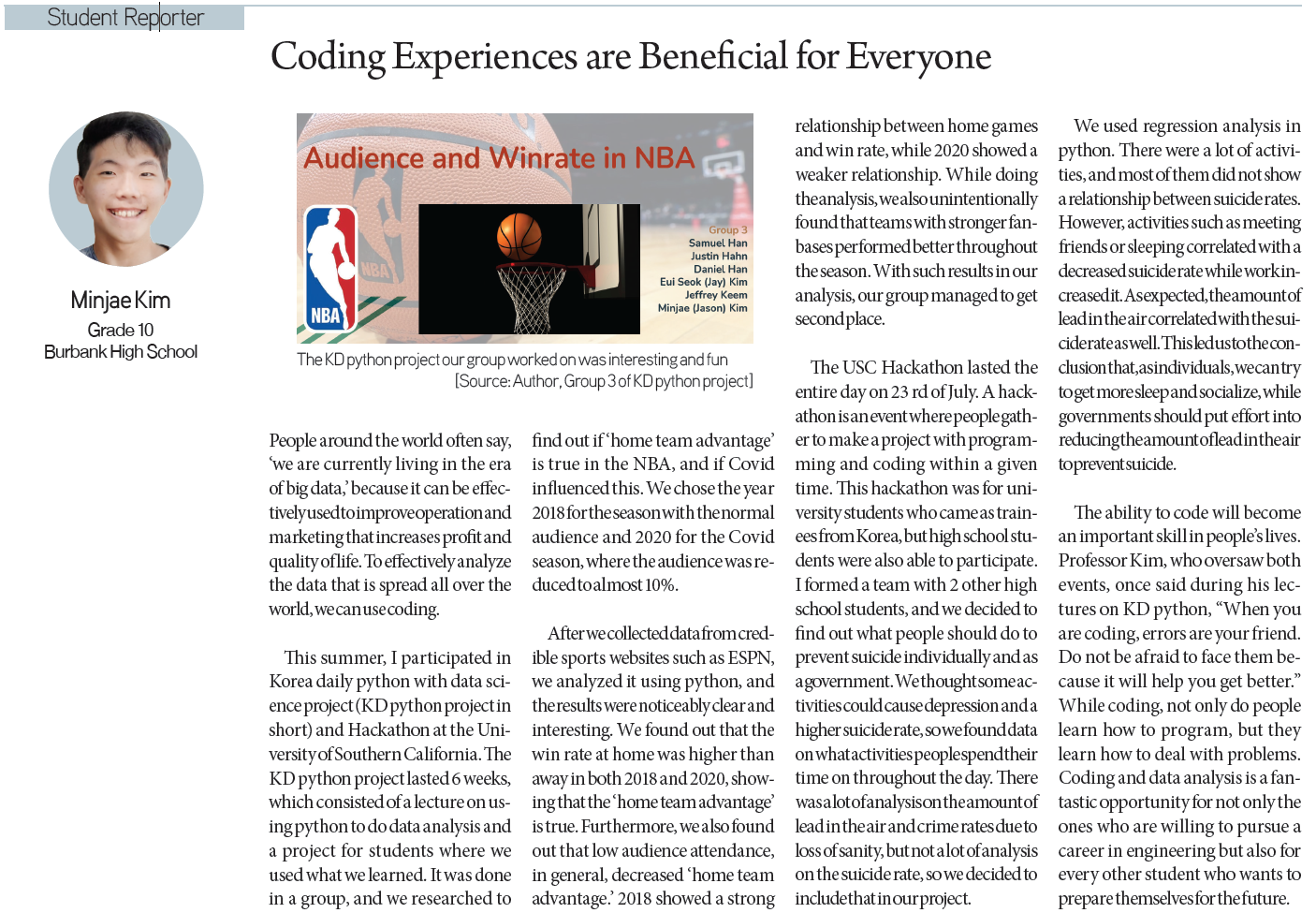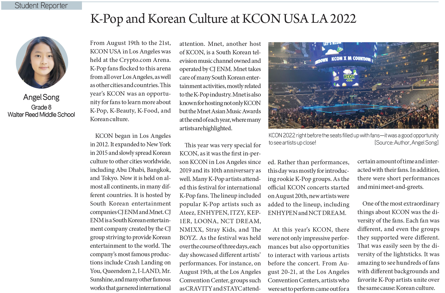 Minjae Kim / Grade 10 / Burbank High SchoolCatherine Han / Grade 12 / Diamond Bar High SchoolAlexis Choi / Grade 10 /South High SchoolAspen Lee / Grade 8 / Santa Fe Christian Middle SchoolAudrey Park / Grade 9 / Northwood High SchoolAngel Song / Grade 8 / Walter Reed Middle School