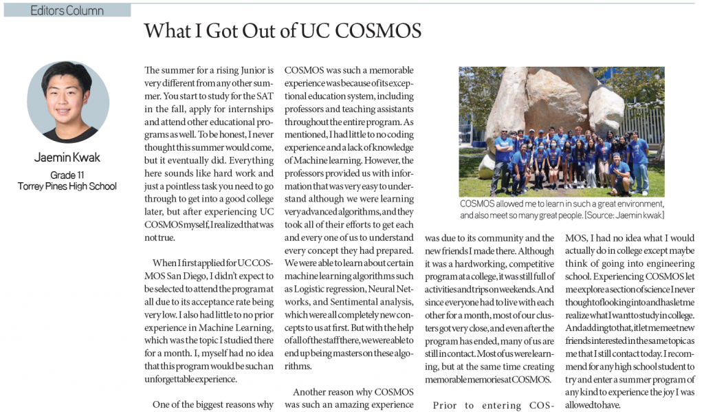 Jeremiah Chun / Grade 10 / West Ranch High SchoolAnnette Je / Grade 11 / Redondo Union High SchoolJaemin Kwak / Grade 11 / Torrey Pines High SchoolLumi Lee / Grade 11 / The Buckley SchoolSoo Young Yoon / Grade 10 / Bergen County AcademiesVeronica Hankil / Grade 12 / Bishop Montgomery High School