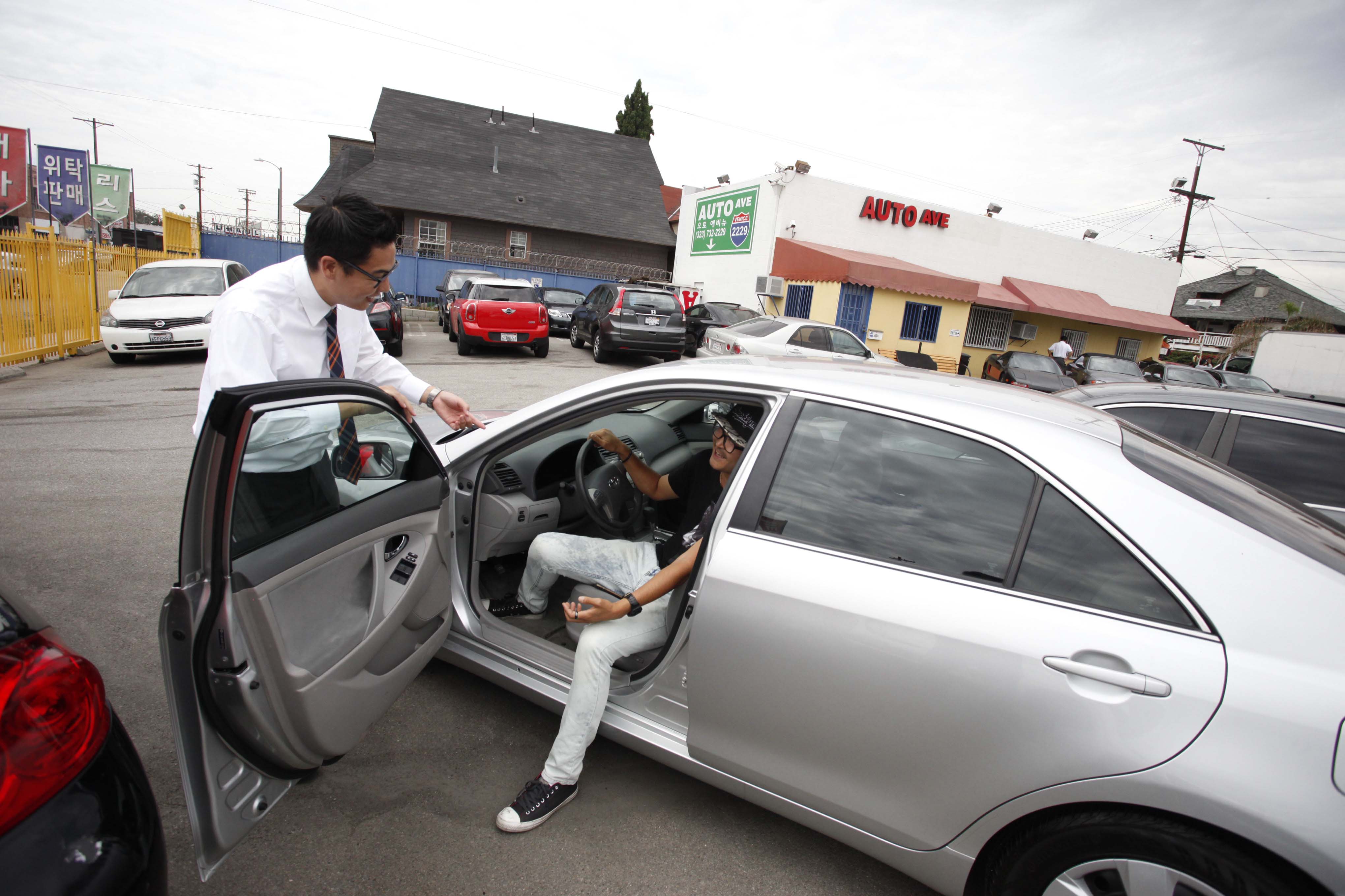 CAPTION: Cosmetic surgery clinics, car dealerships and wireless services are busy in Koreatown as spring training nears. A car salesman at a dealership is introducing a new vehicle to a young customer.