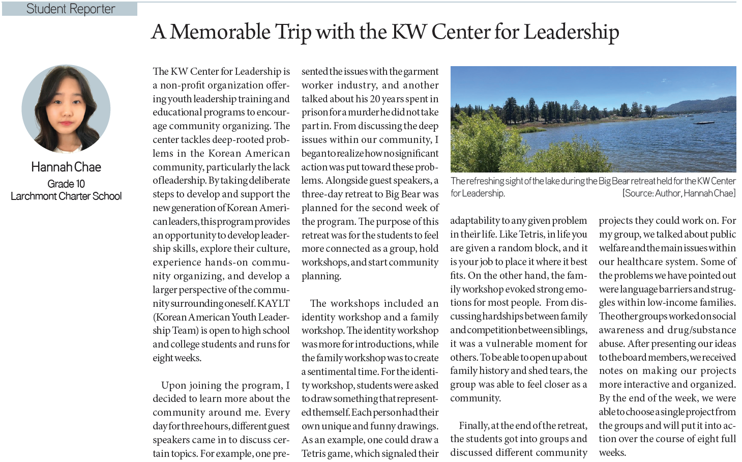 [KD Student Reporters] A Memorable Trip with the KW Center for Leadership (by Hannah Chae) By Korea Daily Digital Jul 5, 2023 3:00 PM PDT Newspaper PDF Download #Zoom in on the article image on click Ashley Seong / Grade 10 / Ruben S. Ayala High School Caleb Lee / Grade 12 / St. Francis High School Seoyoon Kim / Grade 8 / South Lake Middle School Trinity Lee / Grade 11 / Interlake High School Hannah Lee / Grade 11 / South High School Hannah Chae / Grade 10 / Larchmont Charter School Share FacebookXPinterestWhatsApp Tacoma convenience store shooting leaves two seriously injured Apr 27, 2026 10:30 AM PDT Copenhagen Secret? NewJeans comeback 2026 Rumors Confirmed! Apr 27, 2026 9:36 AM PDT Is Your Soul for Sale? Why Gold Land Disney+ is 2026’s... Apr 27, 2026 9:33 AM PDT Slurpees at a Wedding? 7-Eleven Catering Officially Launches! Apr 27, 2026 9:24 AM PDT Load more