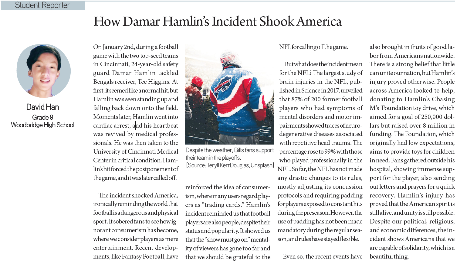 [KD Student Reporters] How Damar Hamlin’s Incident Shook America (by David Han) By Korea Daily Digital Jan 25, 2023 10:36 AM PST Newspaper PDF Download #Zoom in on the article image on click Jonathan Kim / Grade 11 / Culver City High School David Han / Grade 9 / Woodbridge High School Seanna Kim / Grade 11 / Granada Hills Charter High School Eui Seok Kim / Grade 11 / Ribet Academy Joyce Kang / Grade 8 / La Canada High School Audrey Park / Grade 9 / Northwood High School Share FacebookXPinterestWhatsApp Inside Hyundai’s Dust-Free, Low-Noise Smart Factory: The EV Production Hub Powering... Apr 27, 2026 2:18 PM PDT Tacoma convenience store shooting leaves two seriously injured Apr 27, 2026 10:30 AM PDT Copenhagen Secret? NewJeans comeback 2026 Rumors Confirmed! Apr 27, 2026 9:36 AM PDT Is Your Soul for Sale? Why Gold Land Disney+ is 2026’s... Apr 27, 2026 9:33 AM PDT Load more