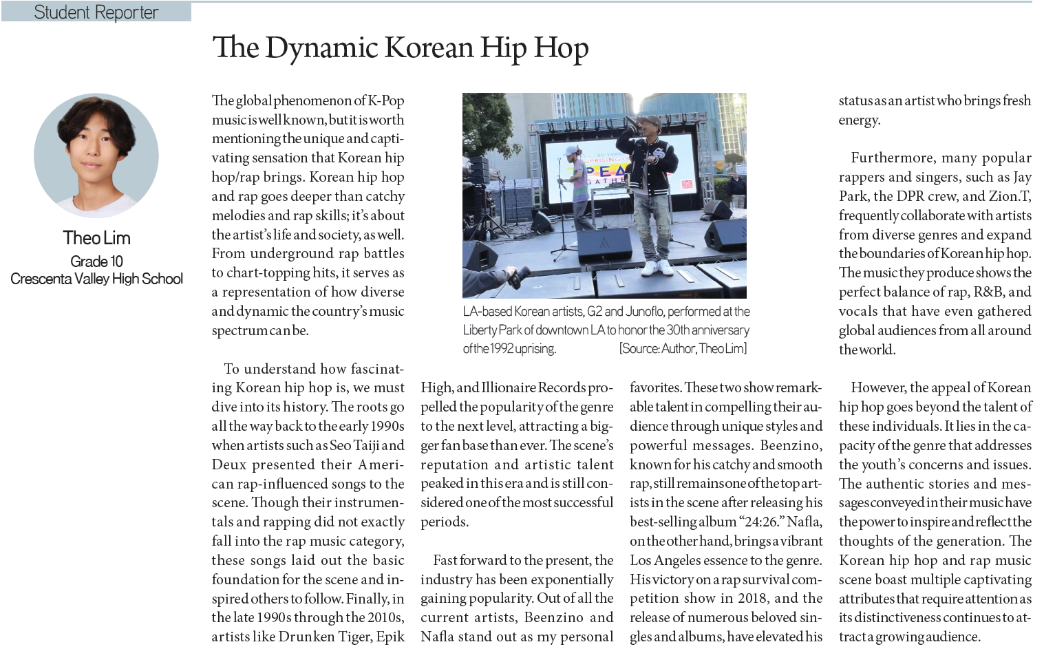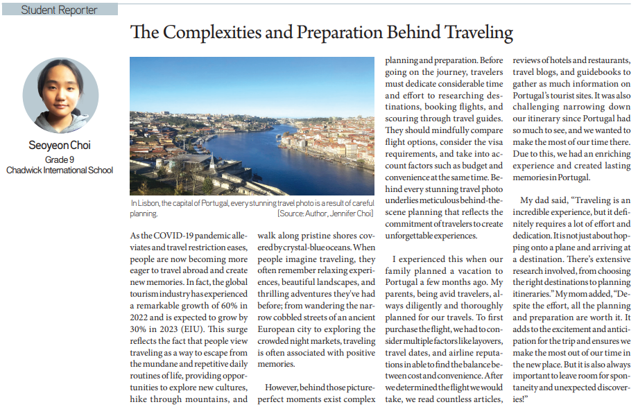 [KD Student Reporters] The Complexities and Preparation Behind Traveling (by Seoyeon Choi) By Korea Daily Digital Jul 12, 2023 11:18 AM PDT Newspaper PDF Download #Zoom in on the article image on click Seoyeon Choi / Grade 9 / Chadwick International School Elena Joo / Grade 12 / Winston Churchill High School Erin Ryu / Grade 10 / Harvard-Westlake School Theo Lim / Grade 10 / Crescenta Valley High School Aspen Lee / Grade 9 / Santa Fe Christian Schools Share FacebookXPinterestWhatsApp White House Shooting Suspect Identified as Caltech Graduate Apr 27, 2026 4:13 PM PDT Homebuyer Assistance Programs California Seminar Draws Buyers Apr 27, 2026 4:05 PM PDT Costco’s New 8-Second Hack: Is Your Costco Checkout Speed About to... Apr 27, 2026 3:50 PM PDT Inside Hyundai’s Dust-Free, Low-Noise Smart Factory: The EV Production Hub Powering... Apr 27, 2026 2:18 PM PDT Load more