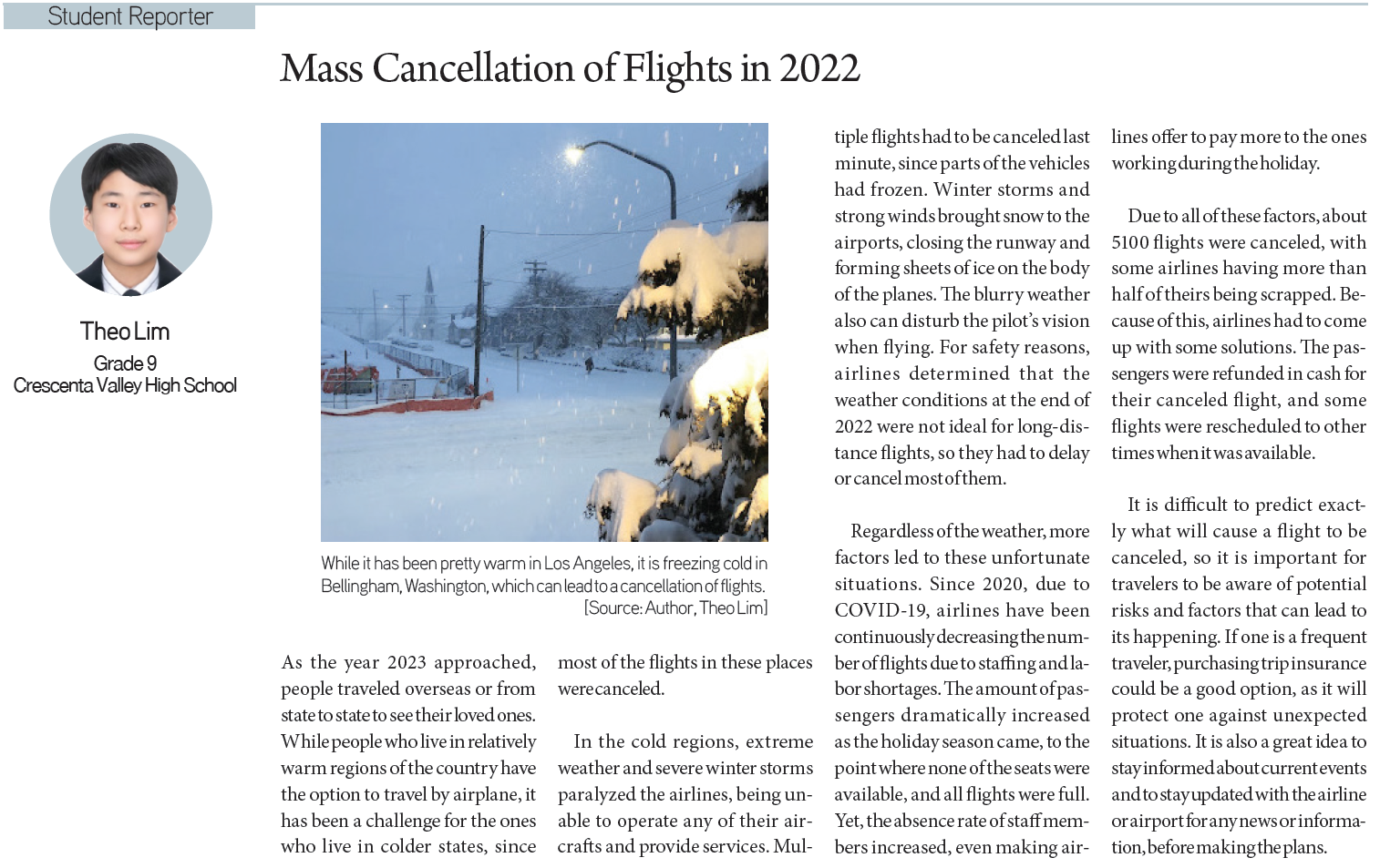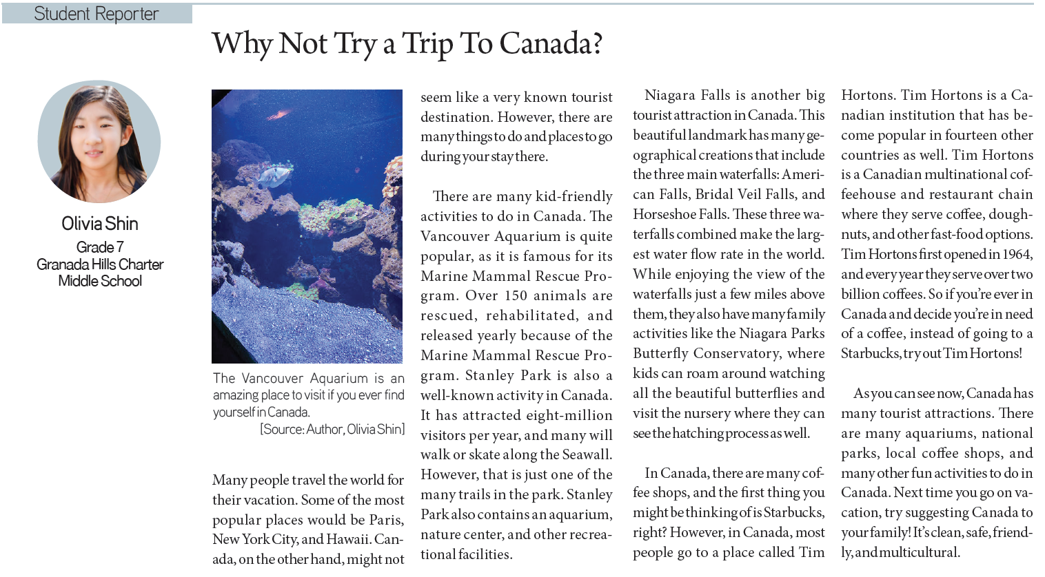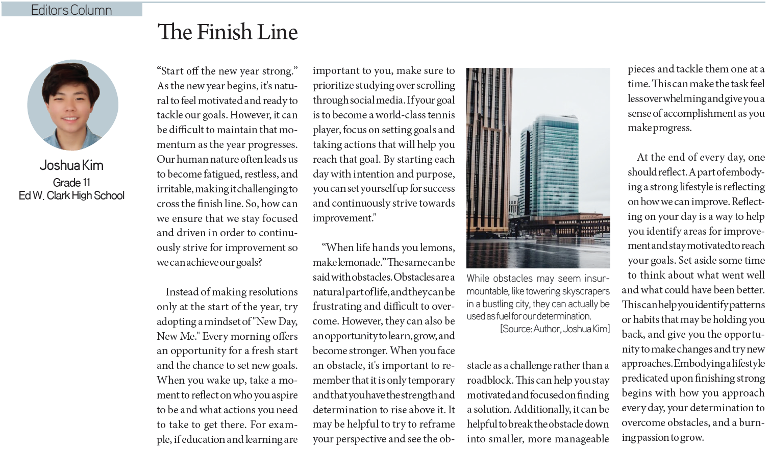 Theo Lim / Grade 9 / Crescenta Valley High SchoolElena Joo / Grade 11 / Winston Churchill High SchoolIan Lee / Grade 7 / Rancho Pico Junior High SchoolOlivia Shin / Grade 7 / Granada Hills Charter Middle SchoolAngel Song / Grade 8 / Walter Reed Middle SchoolJoshua Kim / Grade 11 / Ed W. Clark High School