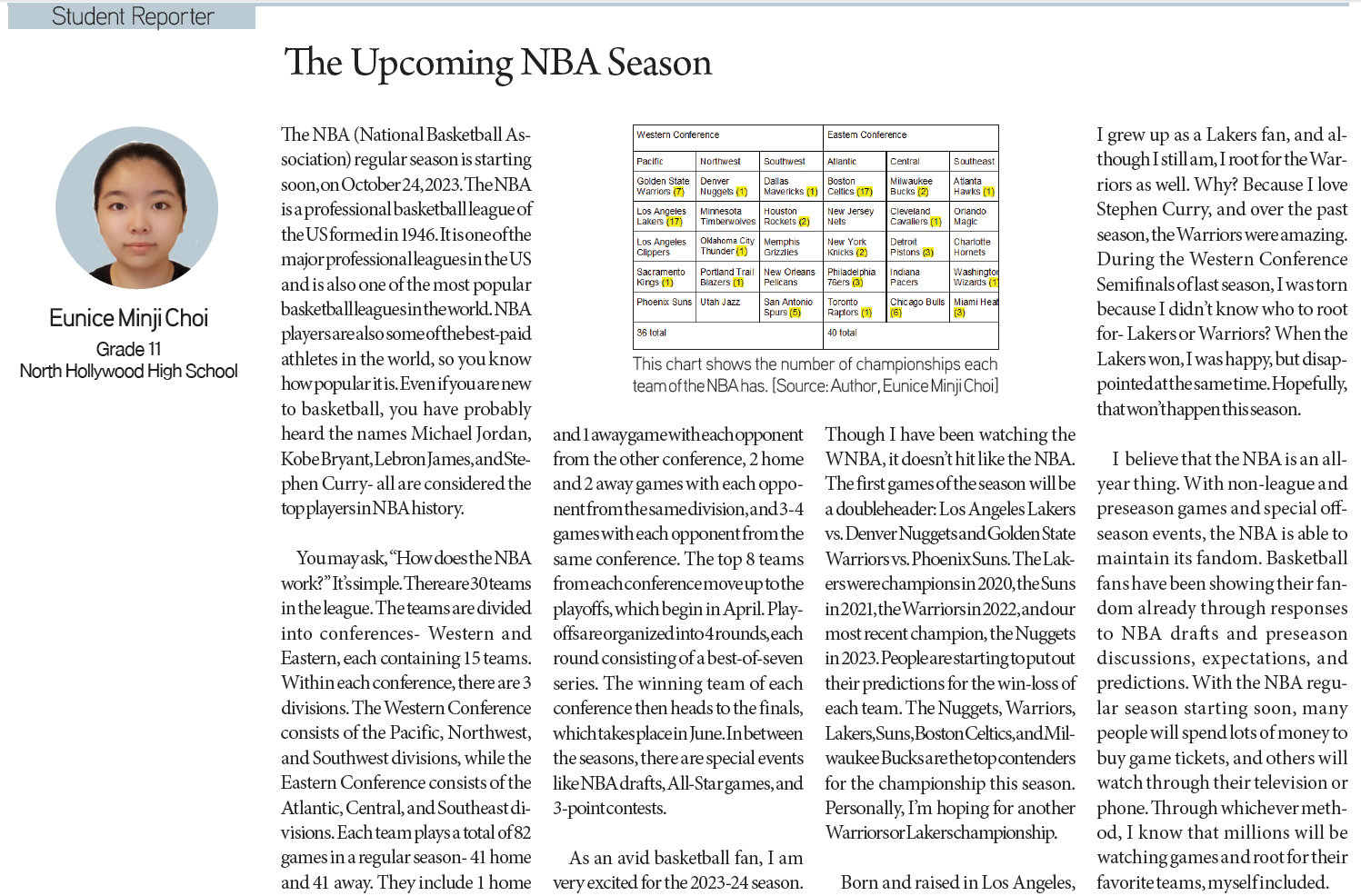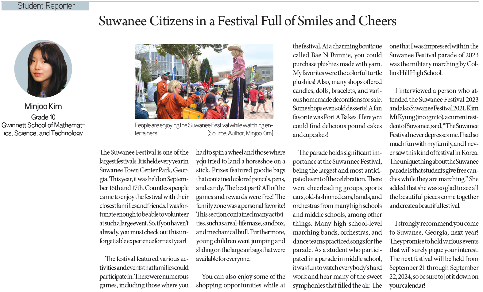 [KD Student Reporters] Suwanee Citizens in a Festival Full of Smiles and Cheers (by Minjoo Kim) By Korea Daily Digital Oct 11, 2023 1:41 PM PDT Newspaper PDF Download ▶Zoom in on the article image on click. Suwanee Citizens in a Festival Full of Smiles and Cheers (by Minjoo Kim) Minjoo Kim / Grade 10 / Gwinnett School of Mathematics, Science, and Technology The Upcoming NBA Season (by Eunice Minji Choi) Eunice Minji Choi / Grade 11 / North Hollywood High School A Budding Journalist’s Ideal Destination: The Princeton Summer Journalism (by Wonjun (Junny) Jung) Wonjun (Junny) Jung / Grade 12 / Grover Cleveland Charter High School My Experience As A Part Of Athletics Social Media Team (by Isleen Lee) Isleen Lee / Grade 10 / Harvard-Westlake School Hidden Gems in the Culinary World (Audrey Park) Audrey Park / Grade 10 / Northwood High School Seattle Young Artist Music Festival: Starring Your Future Musicians (by Hannah Hong) Hannah Hong / Grade 11 / Issaquah High School Share FacebookXPinterestWhatsApp British Highschoolers try Korean Snacks for the first time! Apr 27, 2026 5:20 PM PDT The Must-Watch of 2026 COMING SOON: Colony (군체) Apr 27, 2026 5:18 PM PDT New Viral Coffee Shop in Koreatown LA! Apr 27, 2026 5:06 PM PDT White House Shooting Suspect Identified as Caltech Graduate Apr 27, 2026 4:13 PM PDT Load more