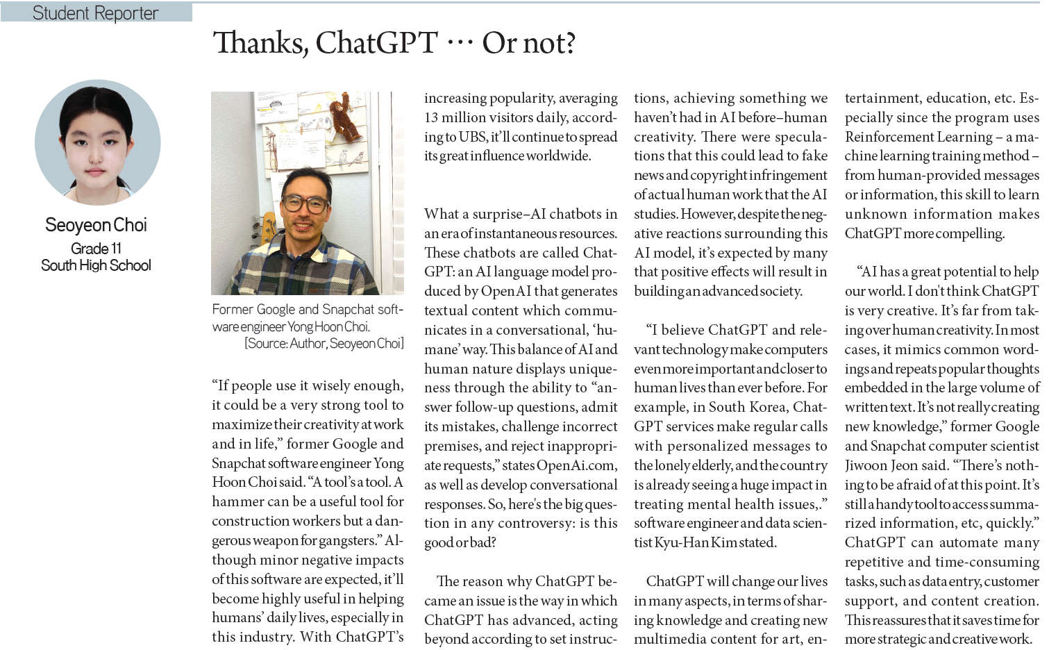 [KD Student Reporters] Thanks, ChatGPT … Or not? (by Seoyeon Choi) By Korea Daily Digital Mar 8, 2023 2:35 PM PST Newspaper PDF Download #Zoom in on the article image on click Seoyeon Choi / Grade 11 / South High School Rubie Choi / Grade 11 / Torrance High School Trinity Lee / Grade 10 / Interlake High School Dion Jung / Grade 11 / Larchmont Charter Seanna Kim / Grade 11 / Granada Hills Charter High School Rena Jeoung Grade 11 / Crescenta Valley High School Share FacebookXPinterestWhatsApp New Viral Coffee Shop in Koreatown LA! Apr 27, 2026 5:06 PM PDT White House Shooting Suspect Identified as Caltech Graduate Apr 27, 2026 4:13 PM PDT Homebuyer Assistance Programs California Seminar Draws Buyers Apr 27, 2026 4:05 PM PDT Costco’s New 8-Second Hack: Is Your Costco Checkout Speed About to... Apr 27, 2026 3:50 PM PDT Load more