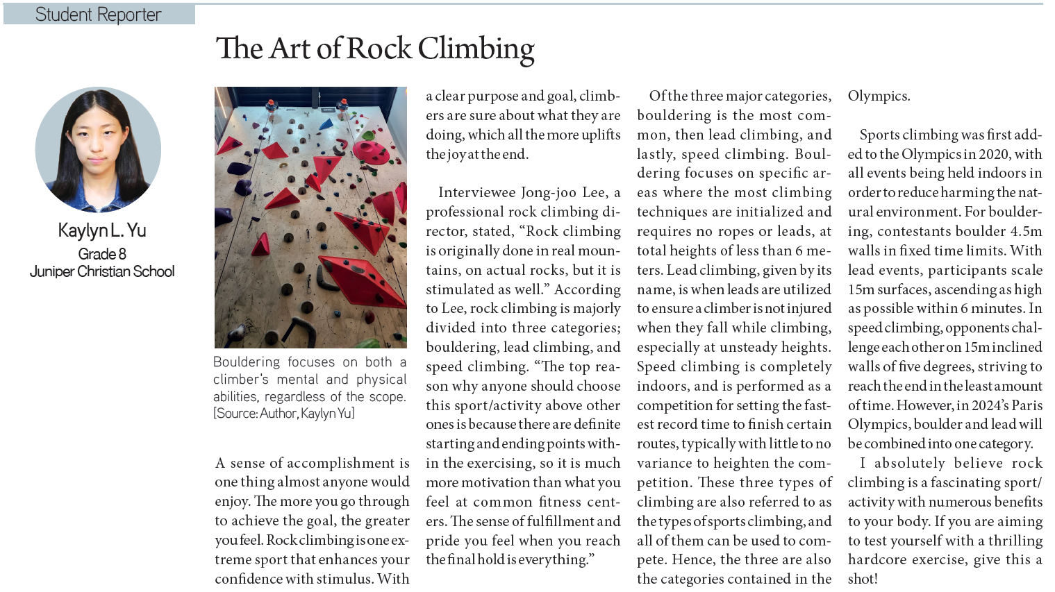 [KD Student Reporters] The Art of Rock Climbing (by Kaylyn L. Yu)