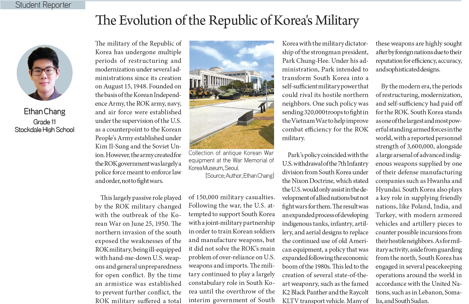 [KD Student Reporters] The Evolution of the Republic of Korea’s Military (by Ethan Chang) By Korea Daily Digital Jun 8, 2023 1:35 PM PDT Newspaper PDF Download #Zoom in on the article image on click Thomas Lee / Grade 11 / Cleveland High School Sarah Kim / Grade 7 / Marlborough School Jacob Kwon / Grade 11 / North Hollywood High School Rachel Chung / Grade 10 / Archer School for Girls Ethan Chang / Grade 11 / Stockdale High School Alexis Choi / Grade 10 / South High School Share FacebookXPinterestWhatsApp White House Shooting Suspect Identified as Caltech Graduate Apr 27, 2026 4:13 PM PDT Homebuyer Assistance Programs California Seminar Draws Buyers Apr 27, 2026 4:05 PM PDT Costco’s New 8-Second Hack: Is Your Costco Checkout Speed About to... Apr 27, 2026 3:50 PM PDT Inside Hyundai’s Dust-Free, Low-Noise Smart Factory: The EV Production Hub Powering... Apr 27, 2026 2:18 PM PDT Load more