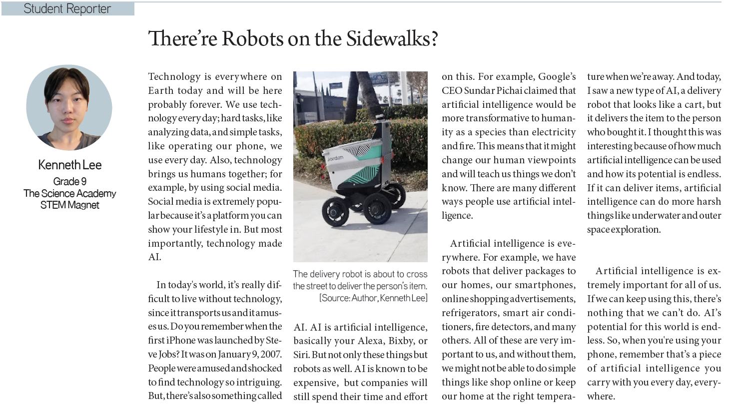 [KD Student Reporters] There’re Robots on the Sidewalks? (by Kenneth Lee) By Korea Daily Digital Feb 8, 2023 2:14 PM PST Newspaper PDF Download #Zoom in on the article image on click Hanul Ju / Grade 10 / Geffen Academy at UCLA Caleb Lee / Grade 11 / St. Francis High School Junny Jung / Grade 11 / Grover Cleveland Charter High School Sungeun Yoon / Grade 9 /Saigon South International School Kenneth Lee / Grade 9 / The Science Academy STEM Magnet James Kim / Grade 10 / Santa Teresa High School Share FacebookXPinterestWhatsApp New Viral Coffee Shop in Koreatown LA! Apr 27, 2026 5:06 PM PDT White House Shooting Suspect Identified as Caltech Graduate Apr 27, 2026 4:13 PM PDT Homebuyer Assistance Programs California Seminar Draws Buyers Apr 27, 2026 4:05 PM PDT Costco’s New 8-Second Hack: Is Your Costco Checkout Speed About to... Apr 27, 2026 3:50 PM PDT Load more