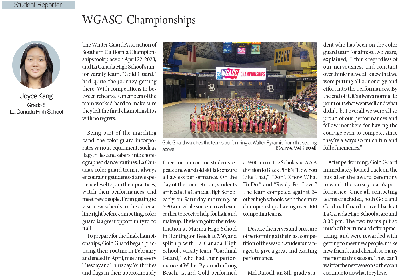 [KD Student Reporters] WGASC Championships (by Joyce Kang) By Korea Daily Digital May 10, 2023 2:35 PM PDT Newspaper PDF Download #Zoom in on the article image on click Hannah Lee / Grade 10 / South High School Joyce Kang / Grade 8 / La Canada High School Minjae Kim / Grade 10 / Burbank High School Dion Jung / Grade 11 / Larchmont Charter School Alex Byun / Grade 10 / Servite High School Hannah Chae / Grade 9 / Larchmont Charter School Share FacebookXPinterestWhatsApp White House Shooting Suspect Identified as Caltech Graduate Apr 27, 2026 6:00 PM PDT British Highschoolers try Korean Snacks for the first time! Apr 27, 2026 5:20 PM PDT The Must-Watch of 2026 COMING SOON: Colony (군체) Apr 27, 2026 5:18 PM PDT New Viral Coffee Shop in Koreatown LA! Apr 27, 2026 5:06 PM PDT Load more