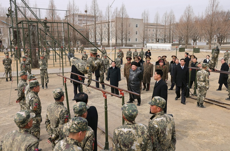 North Korean leader Kim Jong-un inspects Kang Kon Military Academy on February 25. [YONHAP]