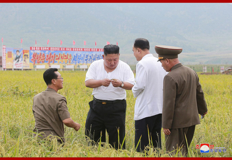 Kim Jong-un personally inspecting grains in a rice field located at the flood site in Daechong-ri, North Hwanghae Province, in September 2020 [KCNA, YONHAP]