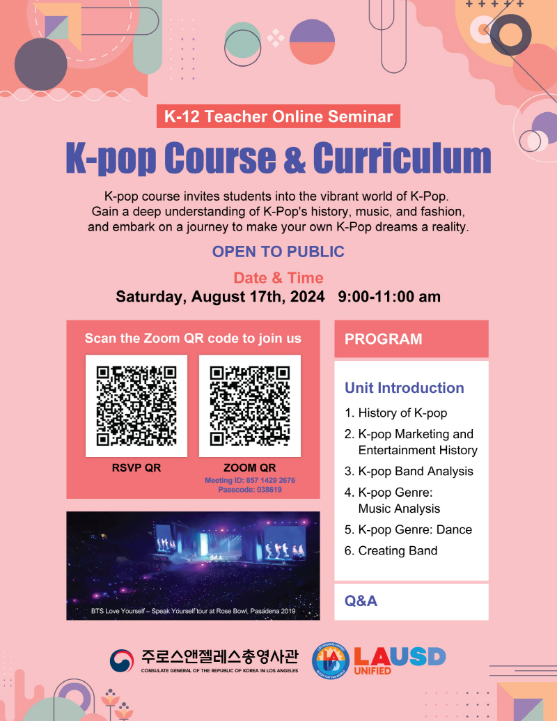 The Consulate General of the Republic of Korea in Los Angeles announced that an online seminar for teachers to explain the K-pop curriculum will be held on August 17 from 9 a.m. to 11 a.m.