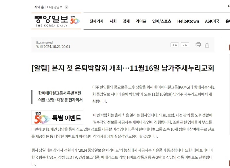 For the prosperous retirement of Korean Americans, the first-ever “Korea Daily Senior Retirement Expo,” in partnership with KAMG (Korean American Medical Group), will be held on Saturday, November 16, at Berendo Street Baptist Church in Los Angeles.