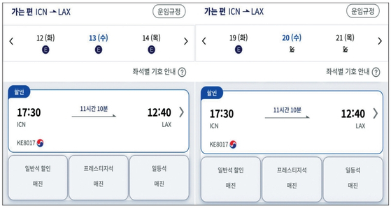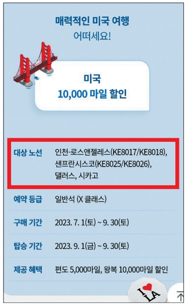 However, the issue lies with the restrictions placed on the LA route. The mileage discount only applies to temporary flights (KE8017/KE8018) that operate on a limited basis, excluding the existing twice-daily LA flights.