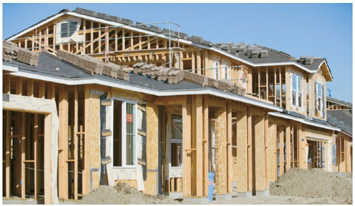 A wooden house under construction, framed with exposed beams as construction progresses.