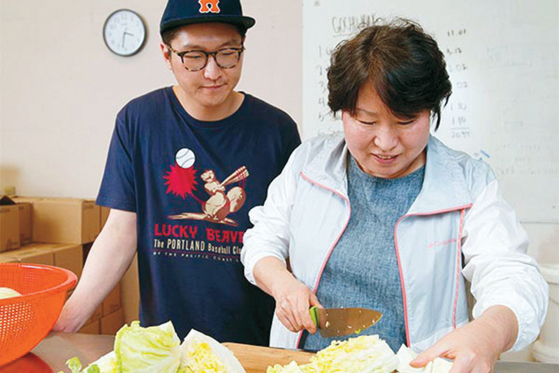 Matthew Choi, left, watches his mom making kimchi. [Choi’s Kimchi Website]