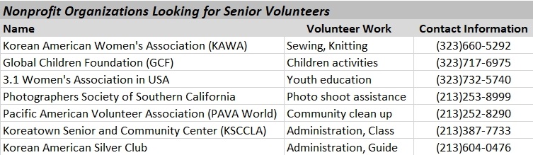 In many places in Koreatown, senior volunteers in their 60s and 80s can be found. The volunteers work for nonprofits, including the KAFLA, Korean Resource Center, and Koreatown Senior and Community Center.