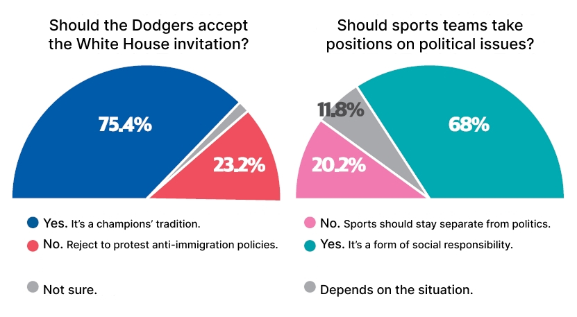 A new survey of Korean American respondents shows strong support for the LA Dodgers visiting the White House, even as an anti-Trump labor group campaigns for players to reject the invitation.