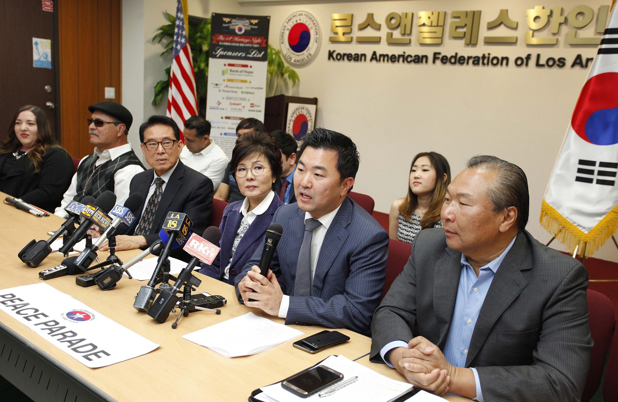 L.A. City Councilman David Ryu (second from right) and Korean American Federation of L.A. chairwoman Laura Jeon are announcing the plans for the event to commemorate the 25th anniversary of the L.A. riots. By Sang Jin Kim