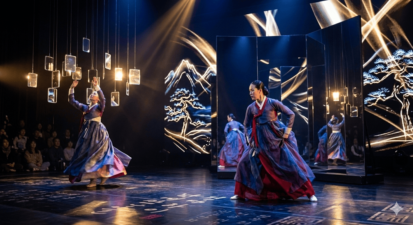 Korean dance holding up mirrors and light