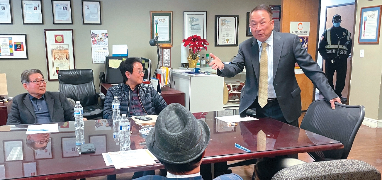 Moo Han Bae, right, argues with three former board members who filed complaints against him with state prosecutors after a regular board meeting at the LA Korean Festival Foundation office on January 3. [Suah Jang, The Korea Daily]