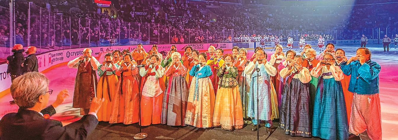 Korean American seniors once again filled Crypto.com Arena with the sound of harmonicas, performing the U.S. national anthem ahead of an LA Kings home game for the second year in a row.