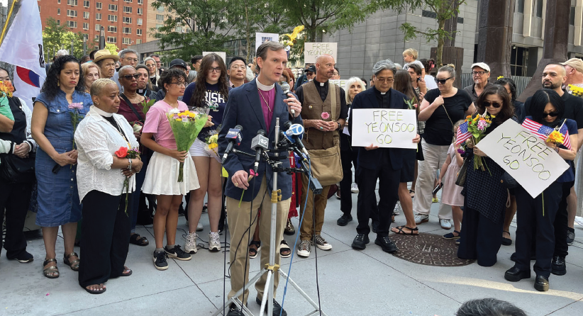 Multiple organizations, including the Episcopal Diocese of New York, the Interfaith Center of New York, and the New York Immigration Coalition, held a press conference outside the Manhattan ICE office on August 2, demanding Koh’s immediate release.