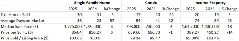 The median sale price for income properties rose 18 percent to $1.645 million, but the price per square foot dropped 14 percent to $390, indicating buyers secured larger properties for less per square foot. The sales-to-list price ratio for this category was 95 percent, suggesting that price negotiations were common.