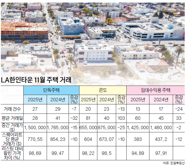 The Los Angeles Koreatown housing market, which had been entering a recovery phase, showed an overall adjustment as both transaction volume and prices softened from a year earlier. Sales fell across single-family homes, condominiums, and rental-income properties, and key price indicators also declined.