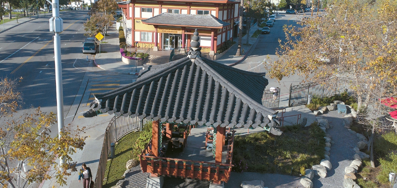 Dawooljeong, a Korean traditional-style pavilion, stands near the future site of a Korean-themed pedestrian walkway in Koreatown. The Korea Daily/Sangjin Kim