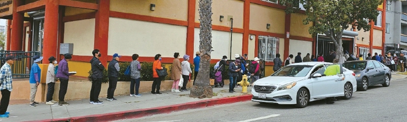 Korean seniors line up at the LA Koreatown Senior & Community Center, which provides free lunch boxes. [Sangjin Kim]