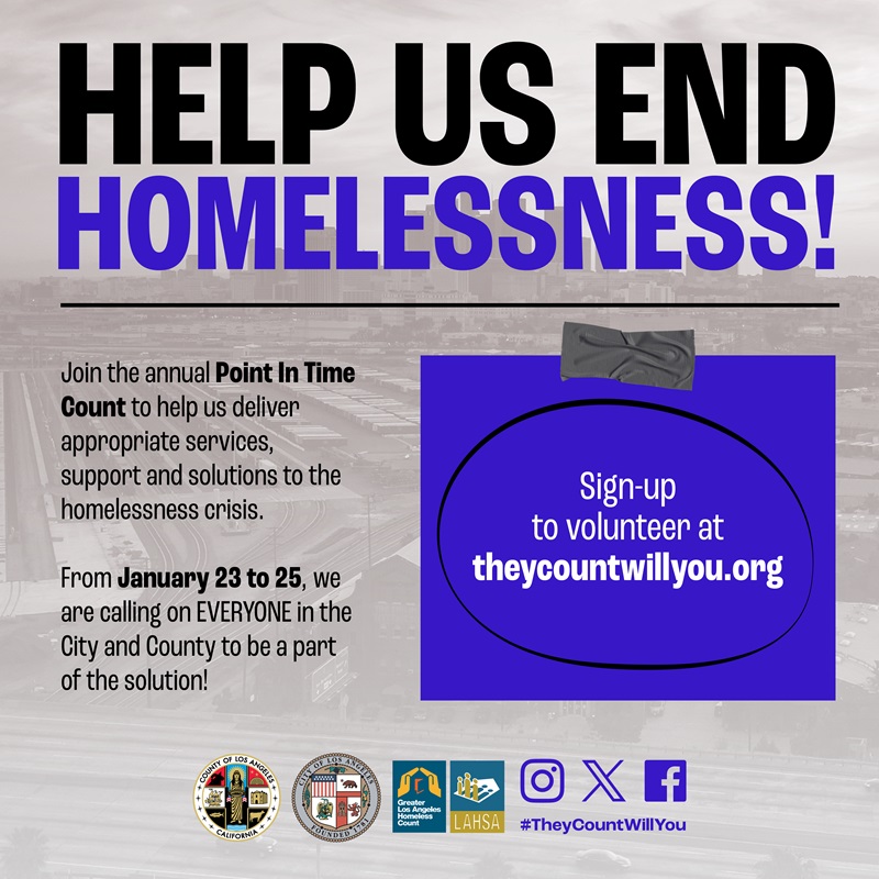 The annual Greater Los Angeles Homeless Count includes the Youth Count and the Housing Inventory Count. LAHSA will conduct the Youth Count from Jan. 22 through Jan. 31 and the Housing Inventory Count on Wednesday.