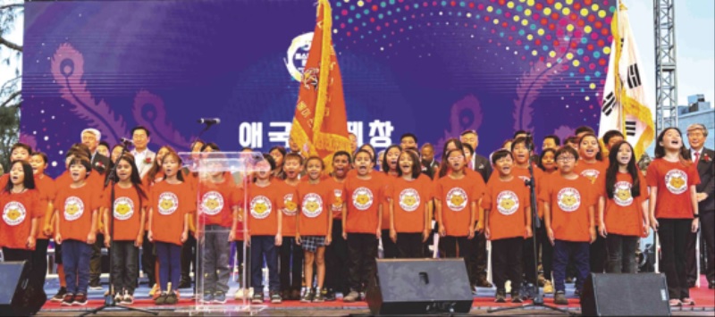 The LA Korean Festival, celebrating its 50th anniversary this year, kicked off on October 12 at Seoul International Park in Koreatown with the theme ‘Great Challenges for the Next 50 Years.’ The four-day festival, running through October 15, will feature a variety of performances and events, along with an agricultural expo. The Kohanga Primary School choir sing the national anthem at the opening ceremony on the evening of October 12. [Sangjin Kim, The Korea Daily]