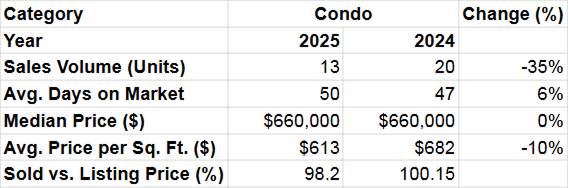 Condo sales slowed, with just 13 units sold, a 35% drop from last year’s 20 units. The median price remained unchanged at $660,000, but the price per square foot fell 10%, from $682 to $613.