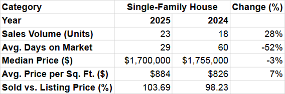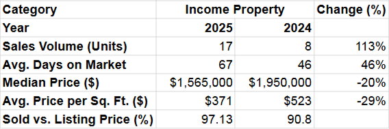 In contrast, investment properties saw strong demand. A total of 17 income properties were sold, more than double last year’s 8 sales, marking a 113% increase. The median price for these properties fell 20%, from $1.95 million to $1.565 million. The price per square foot also declined 29%, from $523 to $371, indicating that lower prices may have attracted more buyers.