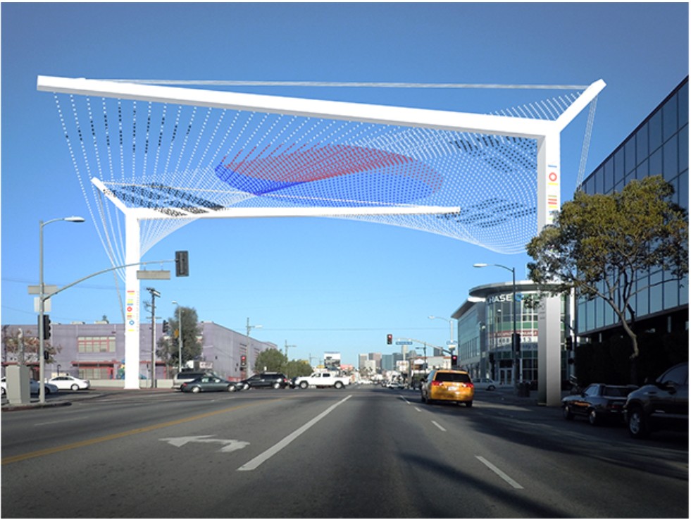The Olympic Gateway will be installed at the intersection of Olympic Boulevard and Normandie Avenue. JFAK said the design represents “a new urban gateway symbolizing Korean identity and commemorating the long-standing friendship between LA and Korea.” The plan features two pillars connected by cables and LED lighting, with imagery inspired by the Taegeukgi and Korean culture displayed along the cables.