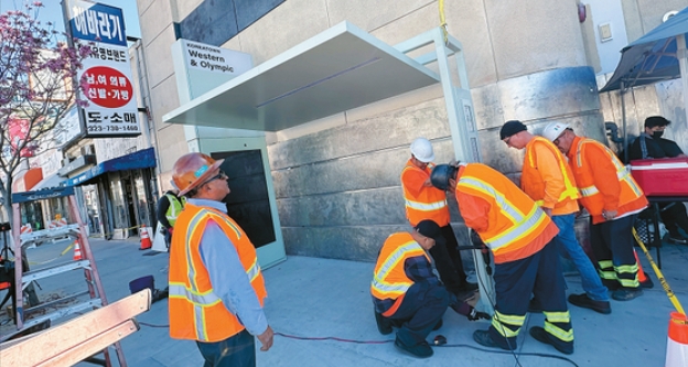 LA city workers are installing a bus shelter at the corner of Olympic Boulevard and Western Avenue on April 9. [Sangjin Kim, The Korea Daily]