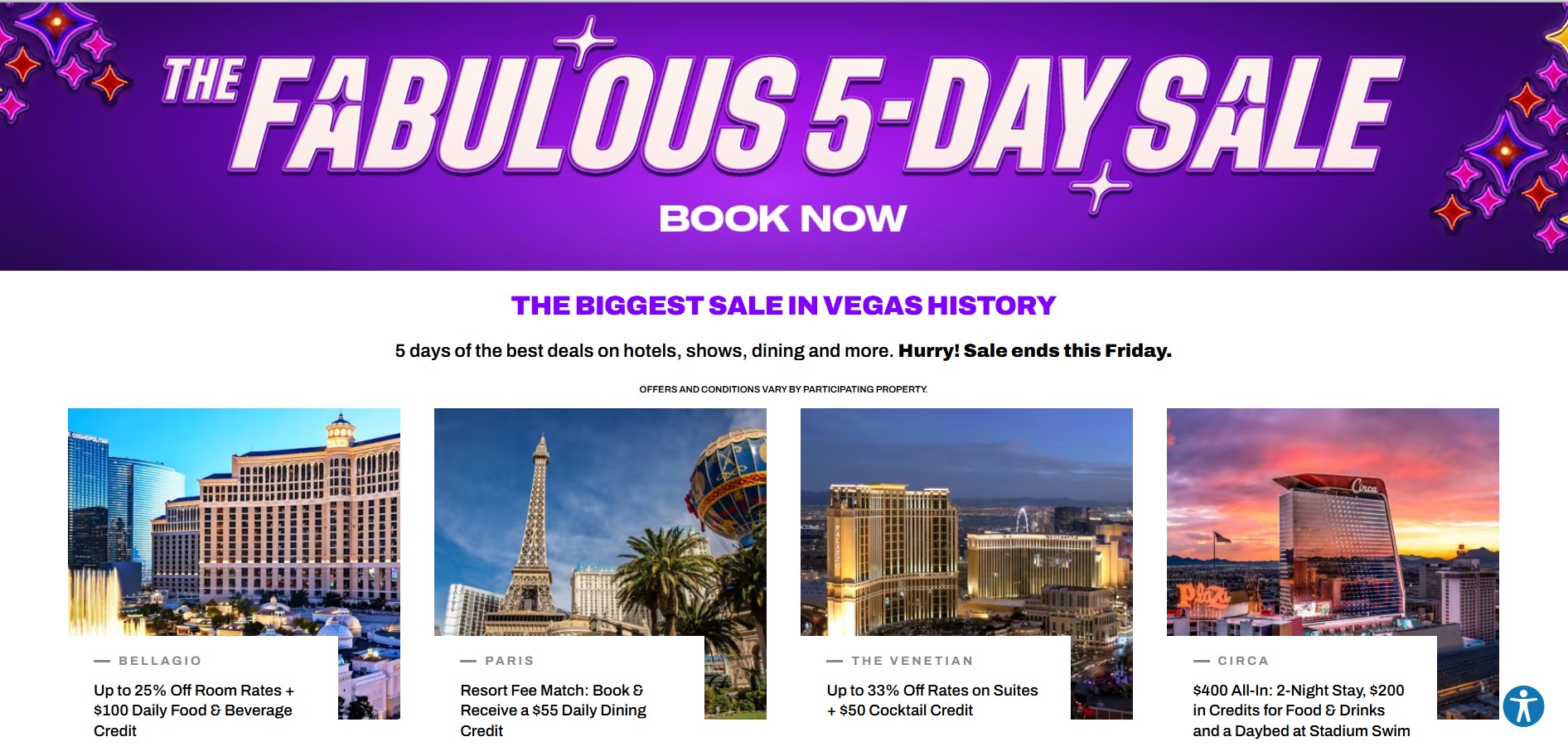 For details on travel deals, visit visitlasvegas.com/deals. Caesars Entertainment offers up to 50% off at 75 properties, including Harrah’s, Flamingo, The LINQ, and Horseshoe hotels. MGM Resorts provides discounts at Mandalay Bay, New York-New York, and Park MGM, while luxury resorts such as Aria and Bellagio offer up to 25% off rooms plus $100 daily food and beverage credit.