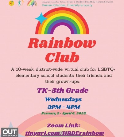 The Rainbow Club is an online and in-school LGBTQ+ club for elementary school students run by the Los Angeles Unified School District’s (LAUSD) Human Relations, Diversity, and Equity (HRDE).