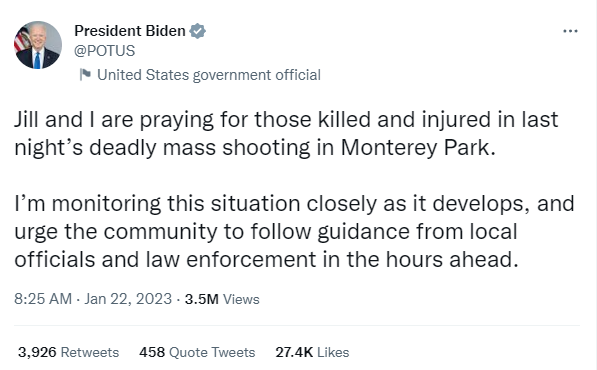 President Joe Biden tweeted on the 22nd, “Jill and I are praying for those killed and injured in last night’s deadly mass shooting in Monterey Park. I’m monitoring this situation closely as it develops, and urge the community to follow guidance from local officials and law enforcement in the hours ahead.” he said.