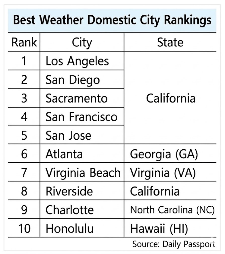 While cities like Atlanta (6th) and Honolulu (10th) made the top ten, they couldn’t touch the consistent “perfection” of the California coast. Experts point out that this isn’t just about being able to wear shorts in February; it’s a massive economic driver.