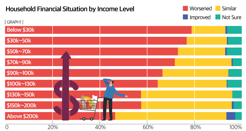 Across all income groups, less than 1% of respondents said their households were better off, but it was as high as 3.7% of those earning $200,000 or more, indicating a widening gap between the rich and poor in the Korean-American community. The biggest increase in expenditure due to rising prices was on groceries (60.7%). Gasoline (13.7%) and housing (10.9%) also had a significant impact on living expenses.