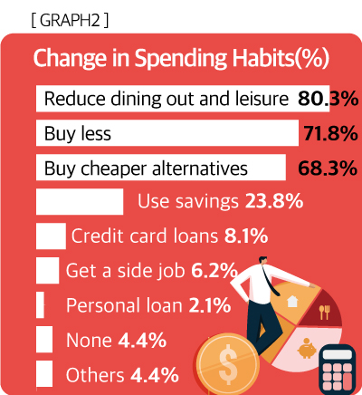 As the burden of living expenses increased, Korean-American consumers cut back on spending. As many as 80.3% of respondents cut back on eating out and leisure expenses. This was followed by reducing overall purchases (71.8%) and buying cheaper alternatives (68.3%). After saving expenses, the next most common response was using savings (23.8%). However, only 6.2% of Koreans took on side jobs to earn extra income.