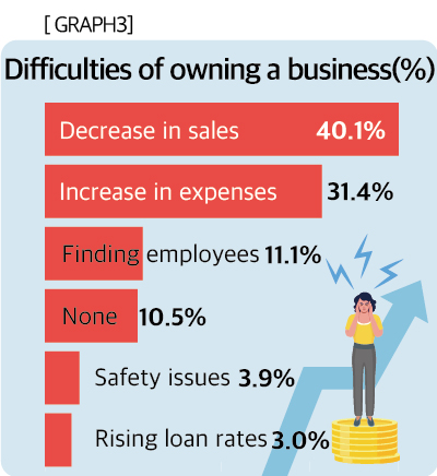The top two items on the list of business challenges were decreased revenue (40.1%) and increased expenses (31.4%). Finding employees (11.1%), security issues (3.9%), and rising loan interest (3.0%) were also cited as factors that made entrepreneurship challenging.